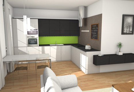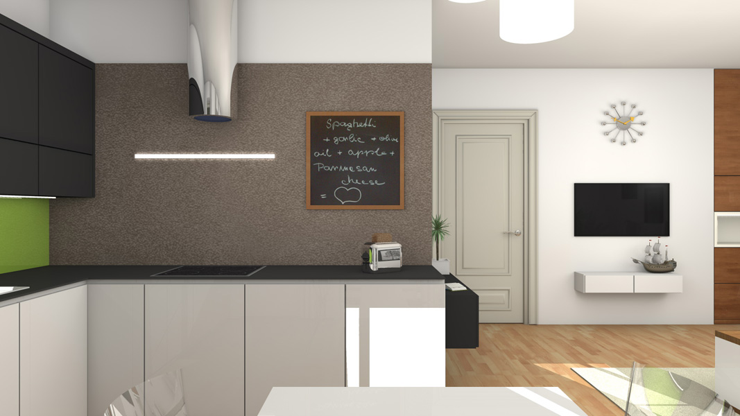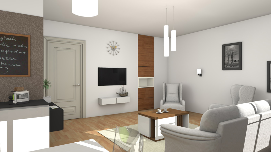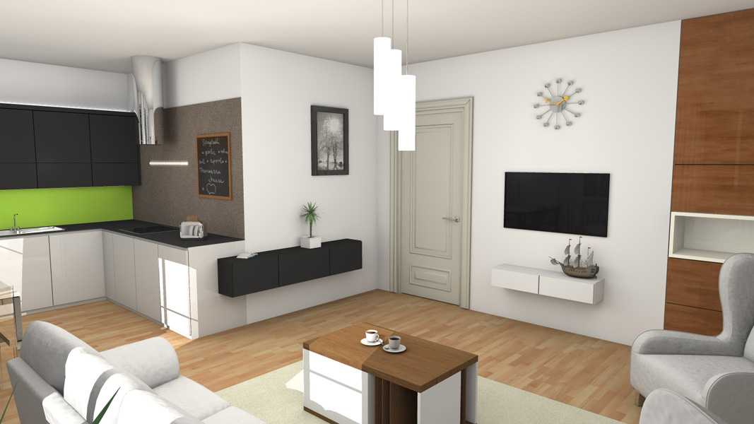 Zadáním byl ideový koncepční návrh hlavního obytného prostoru vyjadřující materiálové a prostorové řešení obývacího pokoje a kuchyňského koutu. Cílem bylo vytvořit vkusnou kombinaci moderního pojetí vnitřního mobiliáře s ohledem na přiznané specifické prvky starých domů se zachováním genus loci typického pro tento typ zástavby minulých let. Návrh kombinuje běžně dostupný mobiliář s nábytkem „na míru“ tak, aby výsledné řešení bylo cenově dostupné a zároveň splnilo estetické požadavky investora a architekta.